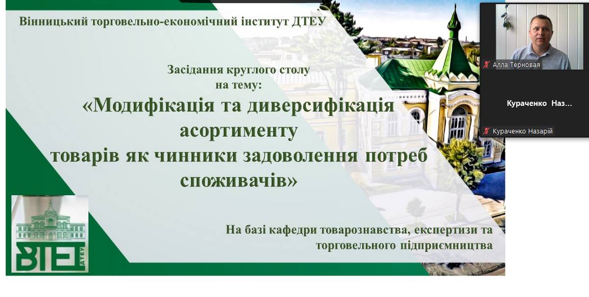 25 травня 2022 року кафедрою товарознавства, експертизи та торговельного підприємництва дистанційно онлайн на платформі Zoom було проведено студентський круглий стіл на тему «Модифікація та диверсифікація асортименту товарів як чинники задоволення потреб споживачів».