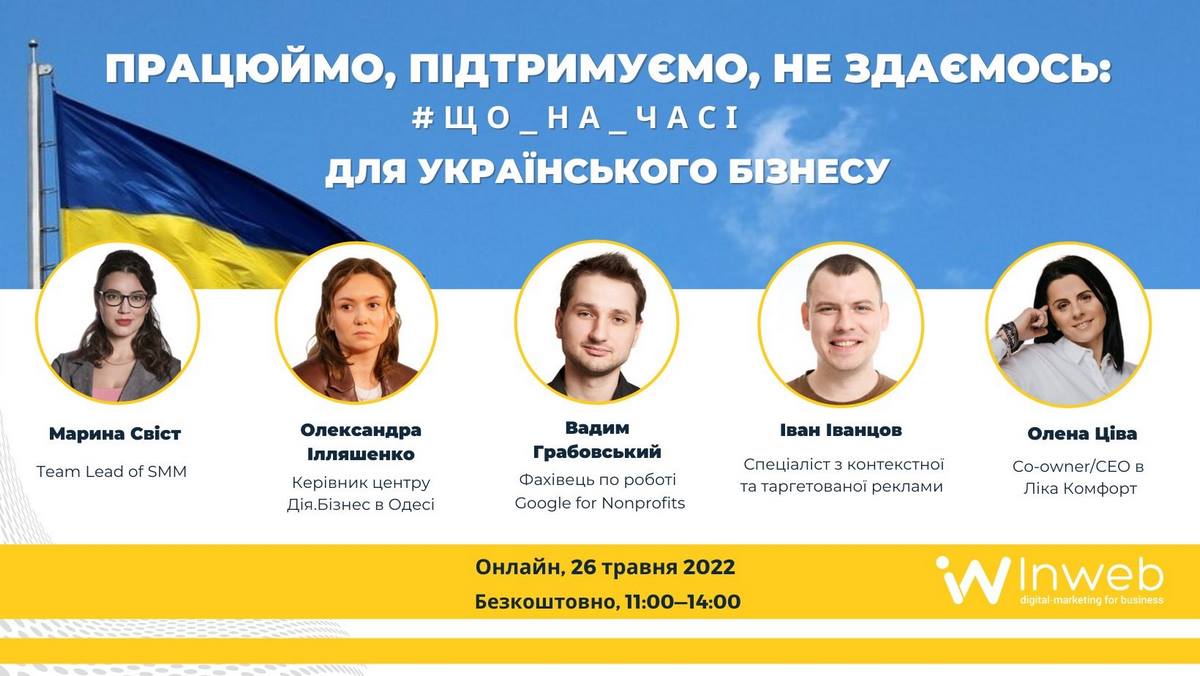 26 травня 2022 року науково-педагогічні працівники кафедри маркетингу та реклами і здобувачі ОП «Маркетинг» ВТЕІ ДТЕУ брали участь в онлайн-івенті «Працюймо, підтримуємо, не здаємось: що на часі для українського бізнесу» від Агенції digital-маркетингу Inweb.