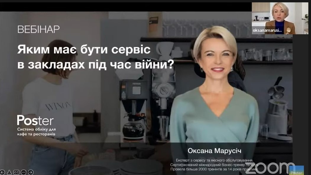 26 травня 2022 року науково-педагогічні працівники кафедри туризму та готельно-ресторанної справи та здобувачі вищої освіти за спеціальностями «Готельно-ресторанна справа», «Туризм» долучилися до онлайн-вебінару «Яким має бути сервіс в закладах під час війни?», організованому командою Poster POS за участю Оксани Марусич, експерту з сервісу та якісного обслуговування, сертифікованому міжнародному бізнес-тренеру та коучу, яка провела більше 2000 тренінгів за 14 років практики.