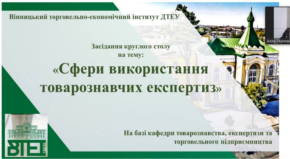 27 травня 2022 року кафедрою товарознавства, експертизи та торговельного підприємництва дистанційно онлайн на платформі Zoom було проведено студентський круглий стіл на тему «Сфери використання товарознавчих експертиз».