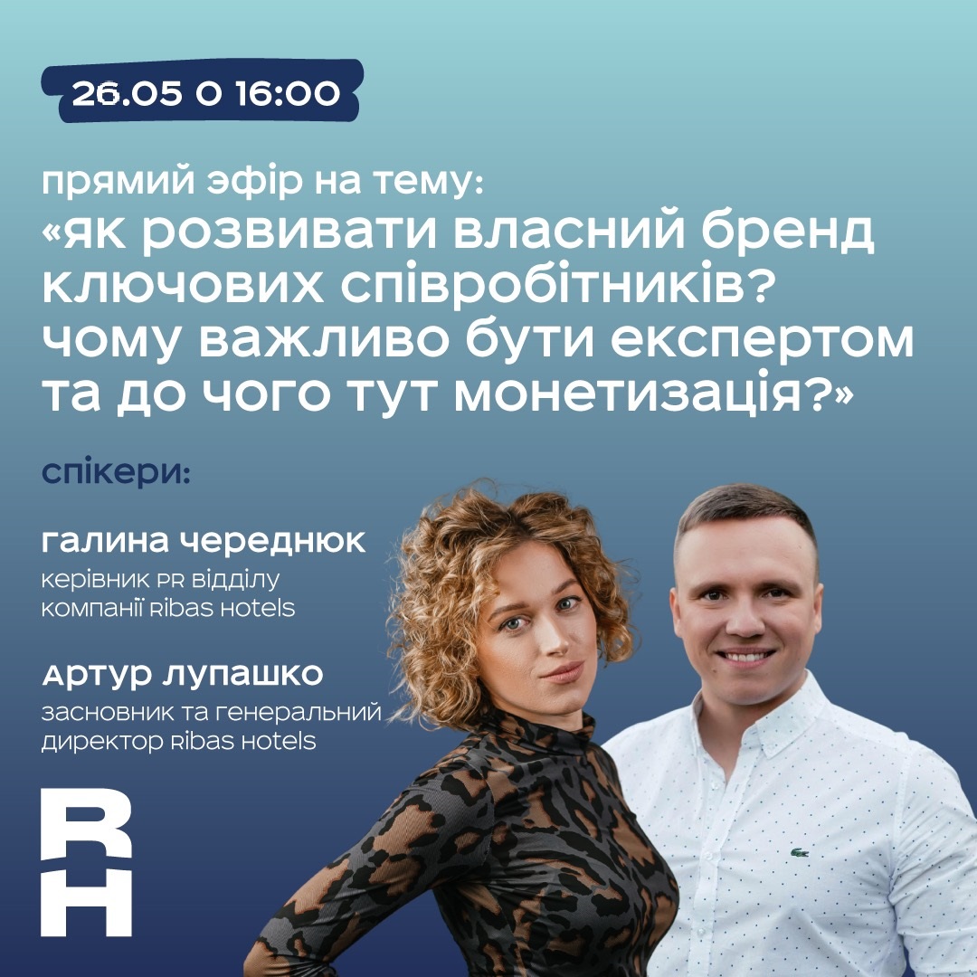 26 травня 2022 року науково-педагогічні працівники кафедри туризму та готельно-ресторанної справи та здобувачі вищої освіти за спеціальностями «Готельно-ресторанна справа», «Туризм» долучилися до онлайн-вебінару «Як розвивати власний бренд ключових співробітників? Чому важливо бути експертом та до чого тут монетизація?», організованому засновником та генеральним директором «Ribas Hotels» Артуром Лупашко та керуючою PR відділу компанії «Ribas Hotels» Галиною Череднюк.