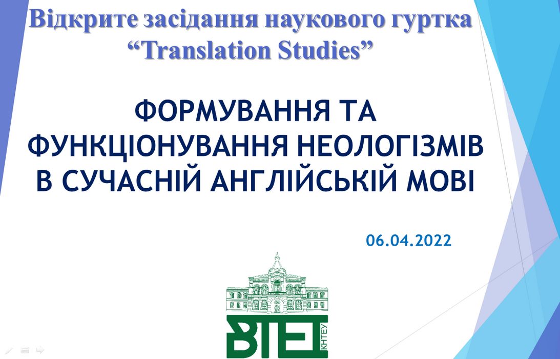 6 квітня 2022 року кафедрою іноземної філології та перекладу Вінницького торговельно-економічного інституту ДТЕУ було проведено відкрите засідання наукового гуртка “Translation Studies” під керівництвом доц. Лариси Довгань на тему “Формування та функціонування неологізмів в сучасній англійській мові”.