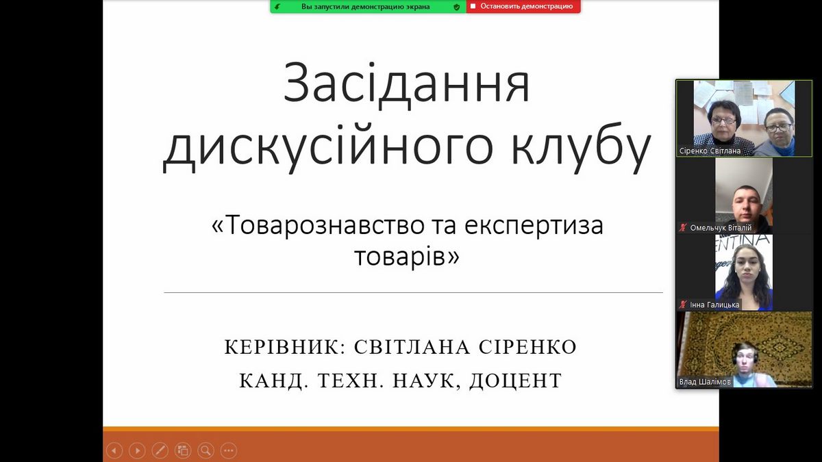 6 квітня 2022 року на кафедрі товарознавства, експертизи та торговельного підприємництва відбулось відкрите засідання дискусійного клубу «Товарознавство та експертиза товарів». Керівник дискусійного клубу Сіренко Світлана. У засіданні взяли участь здобувачі освітнього ступеня «магістр» освітньої програми «Товарознавства та експертиза в митній справі» у кількості 11 осіб.