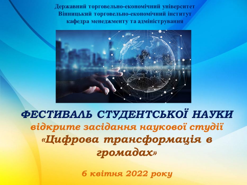 6 квітня 2022 року кафедрою менеджменту та адміністрування було проведено відкрите засідання наукової студії «Цифрова трансформація в громадах» (керівниця – доцентка Ірина Ніколіна) в рамках Х Фестивалю студентської науки у Вінницькому торговельно-економічному інституті КНТЕУ.
