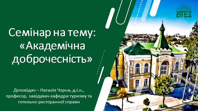 6 квітня 2022 року для здобувачів вищої освіти за спеціальностями 241 «Готельно-ресторанна справа» (ОП «Готельно-ресторанна справа»), 242 «Туризм» (ОП «Міжнародний туристичний бізнес») ОС «магістр», д.і.н., професором, завідувачем кафедри туризму та готельно-ресторанної справи Наталією Чорною було проведено семінар на тему «Академічна доброчесність».