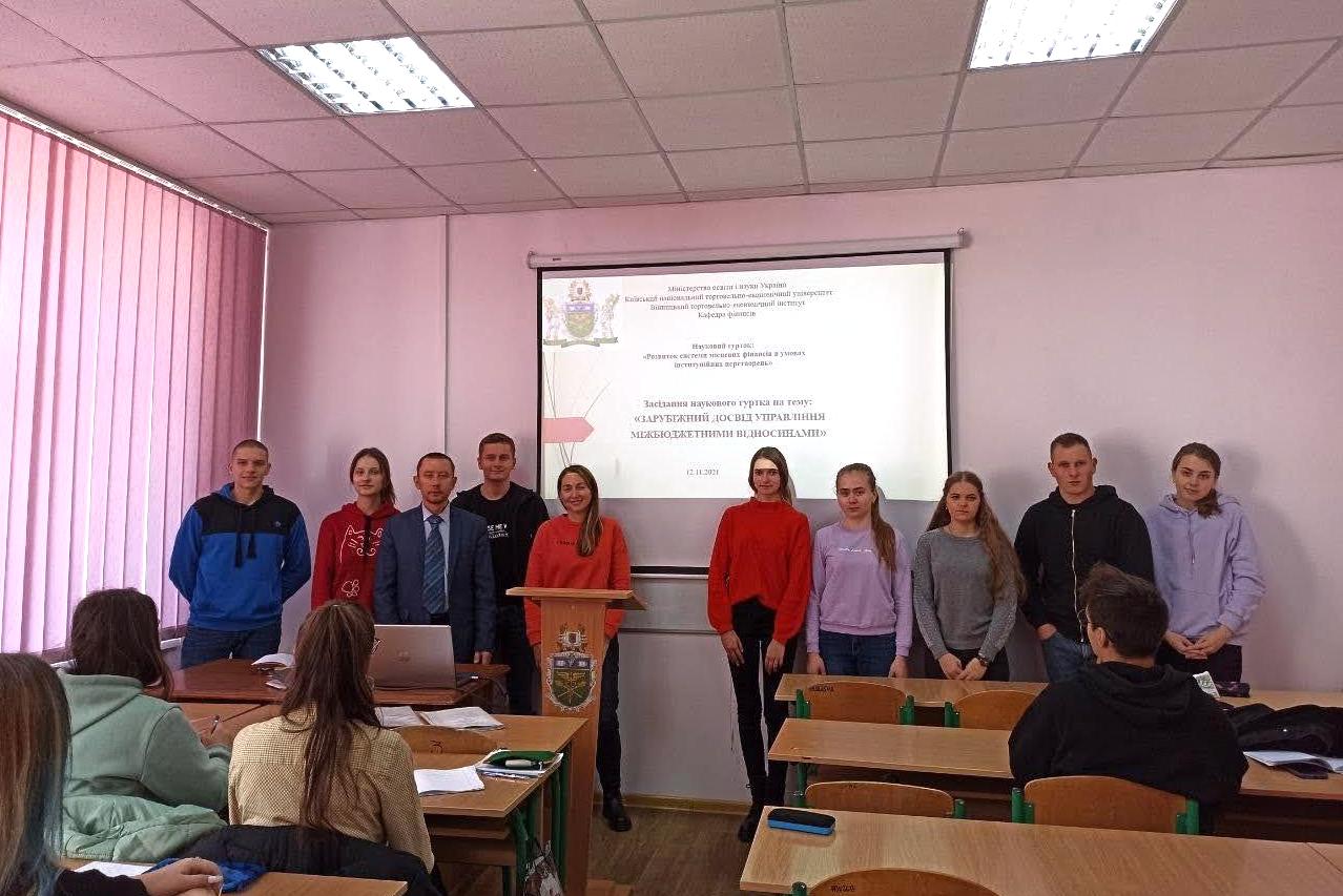 12 листопада 2021 року науково-педагогічними працівниками кафедри фінансів було організовано та проведено засідання наукового гуртка «Розвиток системи місцевих фінансів в умовах інституційних перетворень» на тему «Зарубіжний досвід управління міжбюджетними відносинами» (керівник гуртка – д.е.н., доцент Андрій Нікітішин). Під час засідання з доповідями виступили здобувачі вищої освіти спеціальності «Фінанси, банківська справа та страхування» ОС «молодший бакалавр» та «бакалавр»: Єроменко Богдан, доповідь на тему «Організація місцевих фінансів у зарубіжних країнах» (ФБСС-32д); Коваль Руслана, доповідь на тему «Відповідності вітчизняної нормативно-правової бази законодавчим стандартам регулювання місцевого самоврядування ЄС» (ФБСС-31д); Лукашук Катерина, доповідь на тему «Основні моделі організації місцевого самоврядування» (ФБСС-31д); Могулько Андрій, доповідь на тему «Децентралізація та реформування системи органів місцевого самоврядування: зарубіжний досвід» (ФБСС-32д); Мовчан Діана, доповідь на тему «Формування фінансово спроможного місцевого самоврядування» (ФБСС-21мб). У ході дискусії піднімалися актуальні питання щодо розвитку основних засад управління місцевими фінансовими ресурсами в умовах їх обмеженості, створення інституційних умов для підвищення ефективності механізмів та інструментів системи регулювання міжбюджетних відносин як в Україні, так і за кордоном.