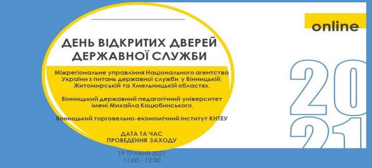 19 травня 2021 року відбувся онлайн-захід «День відкритих дверей державної служби 2021» з ініціативи Міжрегіонального управління Національного агентства України з питань державної служби у Вінницькій, Житомирській та Хмельницькій областях для студентства Вінницького торговельно-економічного інституту КНТЕУ та Вінницького державного педагогічного університету імені Михайла Коцюбинського.