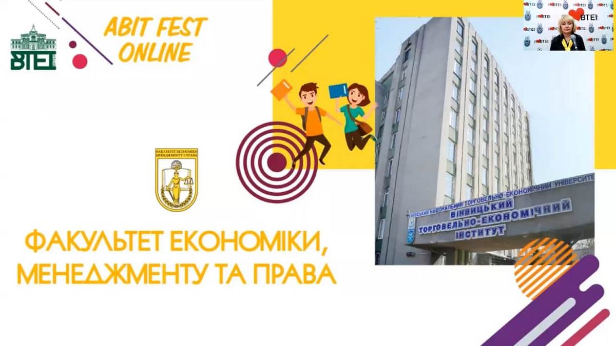 13 квітня 2021 року у Вінницькому торговельно-економічному інституті КНТЕУ відбувся ABIT FEST онлайн на факультеті економіки, менеджменту та права. Під час проведення заходу учасників ознайомлено з інформацією про факультет, спеціальності, перспективами навчання та можливостями для працевлаштування випускників.