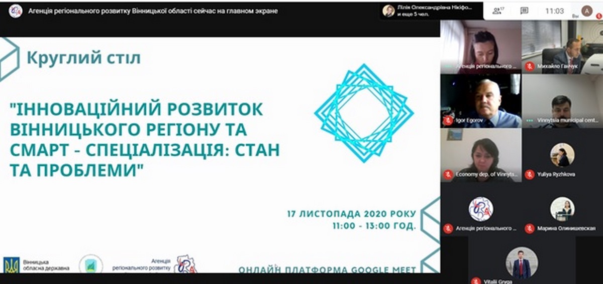 17 листопада 2020 року слухачі Бізнес-школи ВТЕІ КНТЕУ брали участь в круглому столі "Інноваційний розвиток Вінницького регіону та SMART - спеціалізація: стан та проблеми", який проводився Інститутом економіки та прогнозування НАН України в партнерстві із АРР Вінницької області в рамках проєкту регіонального розвитку «Розвиток інноваційної інфраструктури та вдосконалення інноваційної політики регіонів України на основі «розумної спеціалізації», в якому Вінницька область обрана одним із пілотних регіонів України.