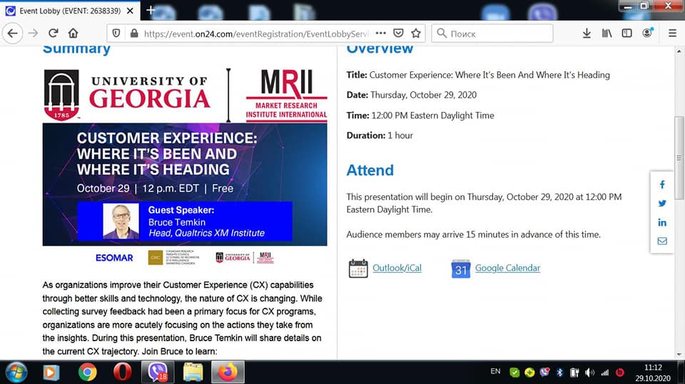 29 жовтня 2020 року викладачі та здобувачі вищої освіти ВТЕІ КНТЕУ - слухачі Бізнес-школи ВТЕІ КНТЕУ брали участь в міжнародному вебінарі на тему "Customer Experience: Where It’s Been And Where It’s Heading" від компанії ESOMAR (European Society of Marketing Research Professionals) — Європейської асоціації дослідників громадської думки і маркетингу.