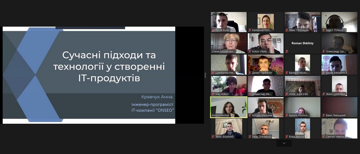 21 жовтня 2020 року у Вінницькому торговельно-економічному інституті КНТЕУ відбувся онлайн майстер-клас на тему «Сучасні підходи та технології у створенні ІТ-продуктів», який організувала кафедра економічної кібернетики та інформаційних систем для студентів спеціальності 126 «Інформаційні системи та технології». Майстер-клас провела випускниця нашого інституту Анна Кравчук, інженер-програміст відомої в Україні та світі ІТ-компанії «ONSEO», що має понад 30-річний успішний досвід у сфері розробки програмного забезпечення різного спрямування.