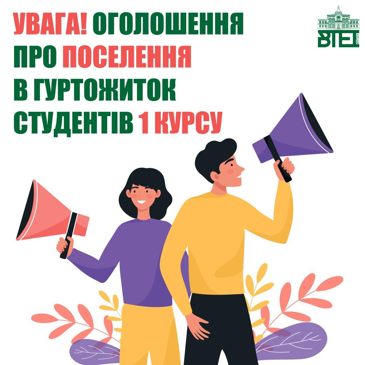 Видача контрактів і ордерів та поселення у гуртожитки студентів 1 курсу буде здійснюватися: