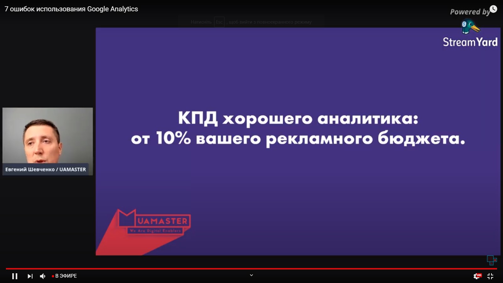 8 вересня 2020 року викладачі та здобувачі вищої освіти ВТЕІ КНТЕУ брали участь у відкритій онлайн лекції "7 помилок використання Google Analytics" від Євгенія Шевченко, фахівця Digital Marketing Strategist, засновника School of Digital Advertising UAMASTER.