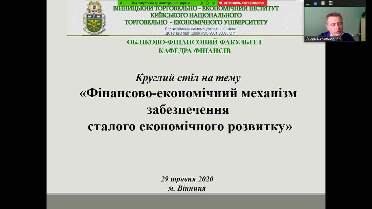 29 травня 2020 року кафедрою фінансів Вінницького торговельно-економічного інституту КНТЕУ на платформі Zoom був проведений Всеукраїнський круглий стіл «Фінансово-економічний механізм забезпечення сталого економічного розвитку».