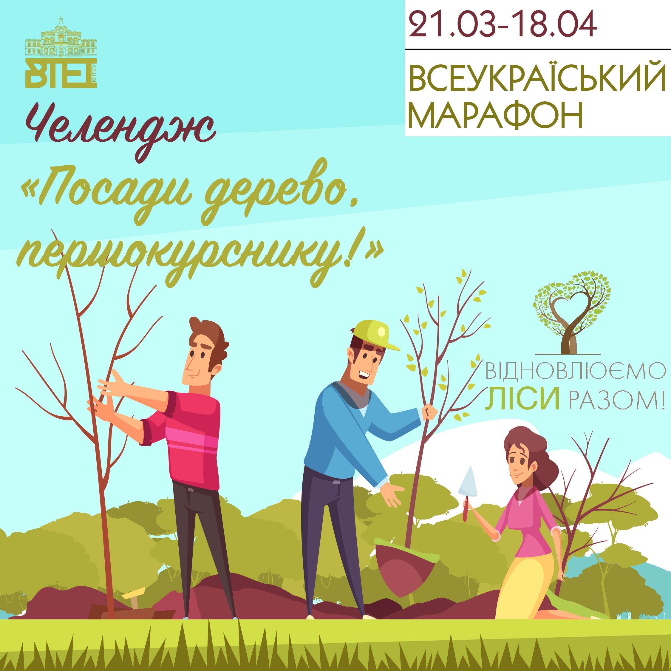 Колектив Вінницького торговельно-економічного інституту КНТЕУ підтримує ініціативу започаткування нової Всеукраїнської акції «Відновлюємо ліси разом» Міністерства енергетики та захисту довкілля, та Державного агентства лісових ресурсів, яка відбуватиметься за підтримки Комітету Верховної Ради України з питань екологічної політики та природокористування.
