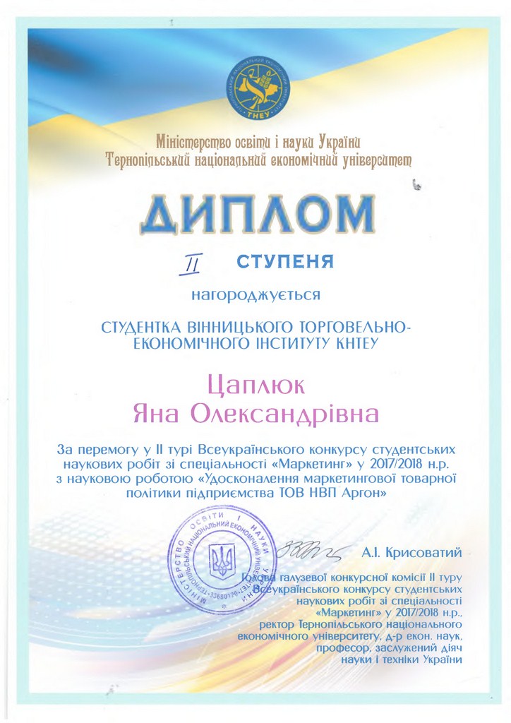12 квітня 2018 року на базі Тернопільського національного економічного університету відбувся ІІ тур Всеукраїнського конкурсу студентських наукових робіт з галузей знань і спеціальностей зі спеціальності «Маркетинг».