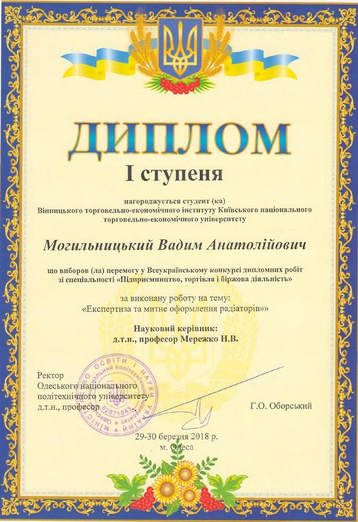29-30 березня 2018 року на базі Одеського національного політехнічного університету відбувся Всеукраїнський конкурс дипломних робіт студентів вищих навчальних закладів зі спеціальності «Підприємництво, торгівля та біржова діяльність».