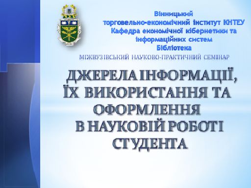25 березня 2015 року відбувся Міжвузівський науково-практичний семінар «Джерела інформації, їх використання та оформлення в науковій роботі студента», організаторами якого виступили кафедра економічної кібернетики та інформаційних систем і бібліотека інституту. В роботі заходу прийняли участь студенти обліково-фінансового факультету ВТЕІ КНТЕУ групи ЕК-31д., ЕК-21д., ЕК-11д., ЕК-11м., а також студенти Вінницького національного аграрного університету, спеціальності «Економічна кібернетика», групи ЕК 41д., та ЕК-11(м).