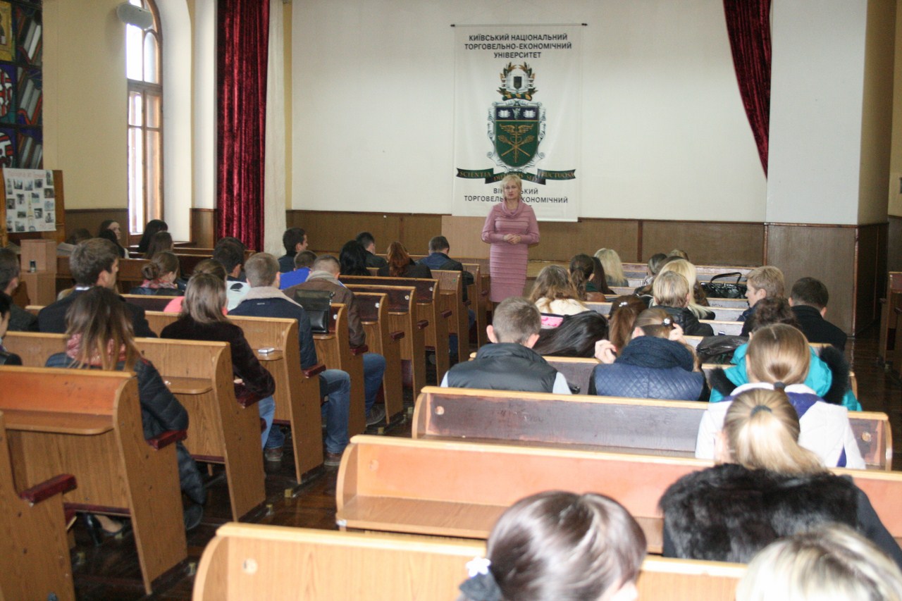 21 жовтня 2014 року в рамках святкування Днів факультету товарознавства, туризму та готельно-рестораної справи у Вінницькому торговельно-економічному інституті Київського національного торговельно-економічного університету кафедрою філософії та економічної теорії (зав. кафедри доктор історичних наук, професор Стопчак М.В.) був проведений брейн-ринг «Молодь у сучасному глобалізованому світі» між збірними командами ФТТГРС та ЗШ №16 і 29 Вінницької міської ради. Із вітальним словом до команд звернулася заступник декана факультету Рябенька М.О., яка розповіла учням про особливості навчання в інституті, про спеціальності, за якими проводиться підготовка на факультеті, про підготовку на базі інституту до ЗНО, надала рекламно-інформаційні матеріали. Власне, брейн-ринг пройшов у цікавій, безкомпромісній боротьбі: з мінімальною перевагою перемогла збірна команда студентів І курсу ФТТГРС.