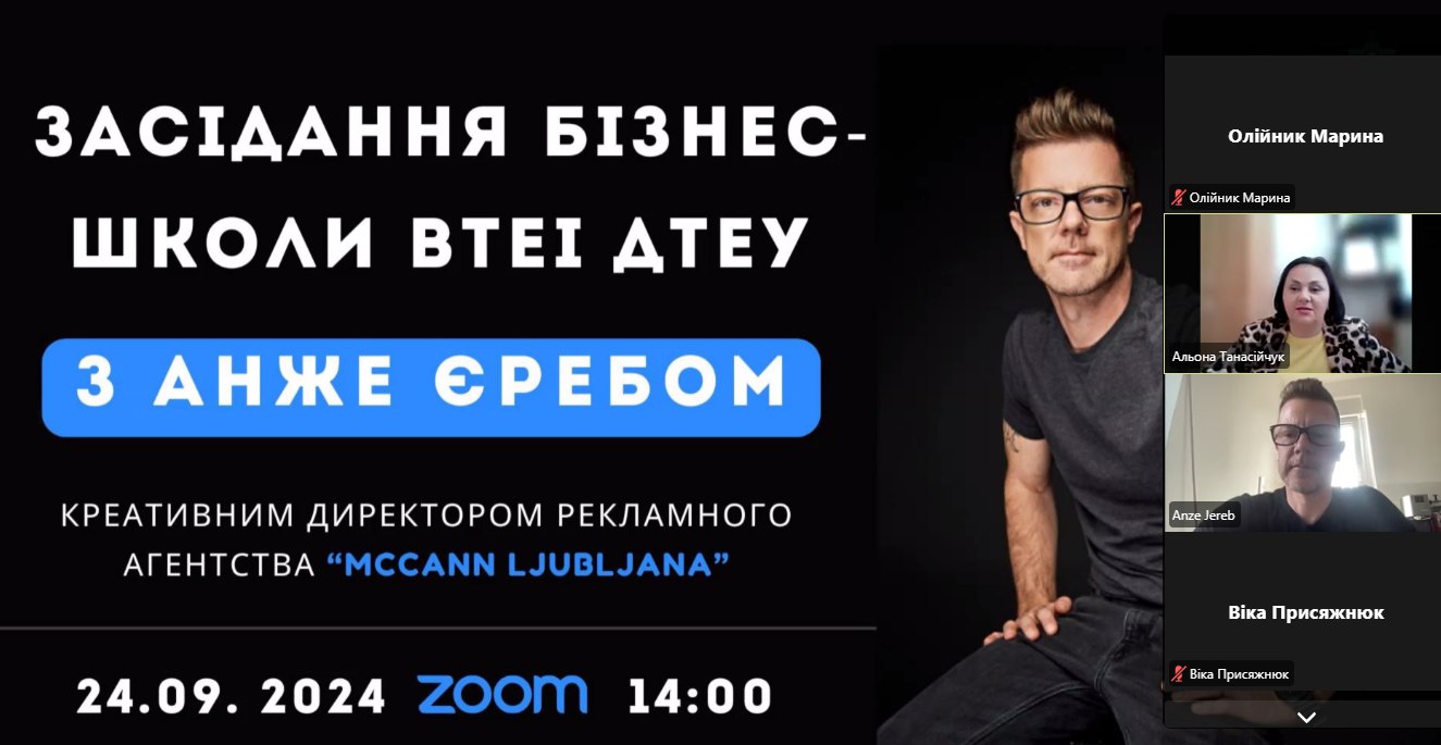24 вересня 2024 року відбулося засідання Бізнес-школи ВТЕІ ДТЕУ з Анже Єребом, креативним директором рекламного агентства «McCann Ljubljana», Словенія.