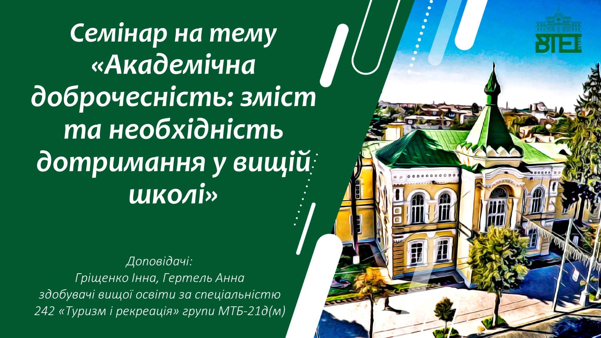 12 вересня 2024 року для здобувачів вищої освіти за спеціальностями 181 «Харчові технології», 241 «Готельно-ресторанна справа», 242 «Туризм» / «Туризм і рекреація» ОС «бакалавр» було проведено семінар на тему «Академічна доброчесність: зміст та необхідність дотримання у вищій школі».